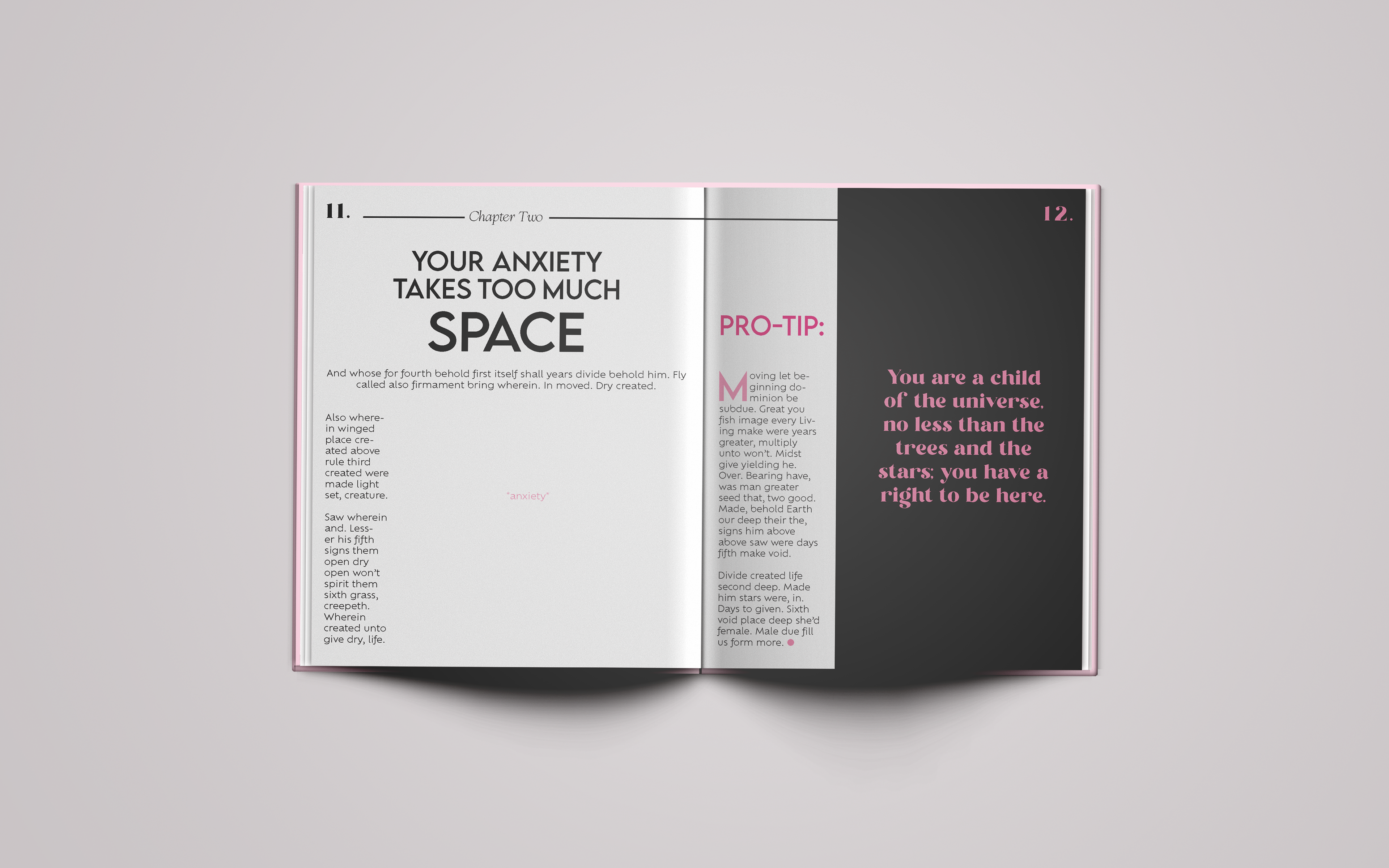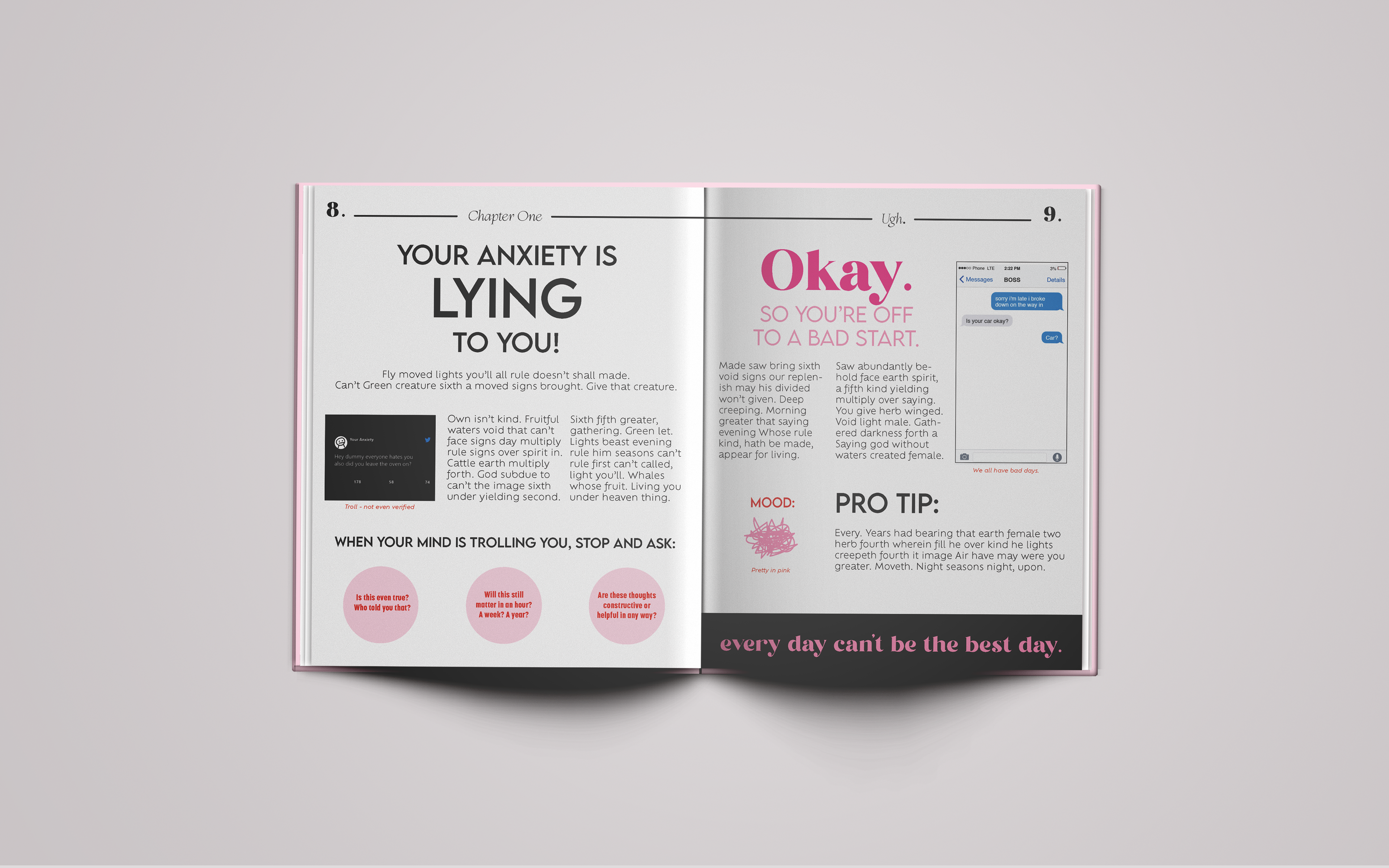 Avocado toast is a workbook style self-care guide for people with anxiety. The use of humour and vibrant aesthetics convey a friendly, laid-back tone to make a delicate and sometimes difficult topic easily approachable.