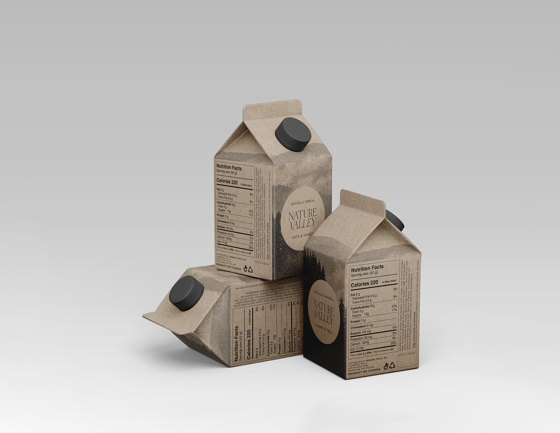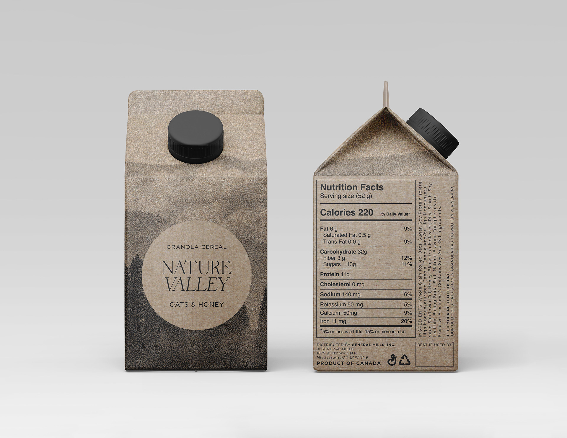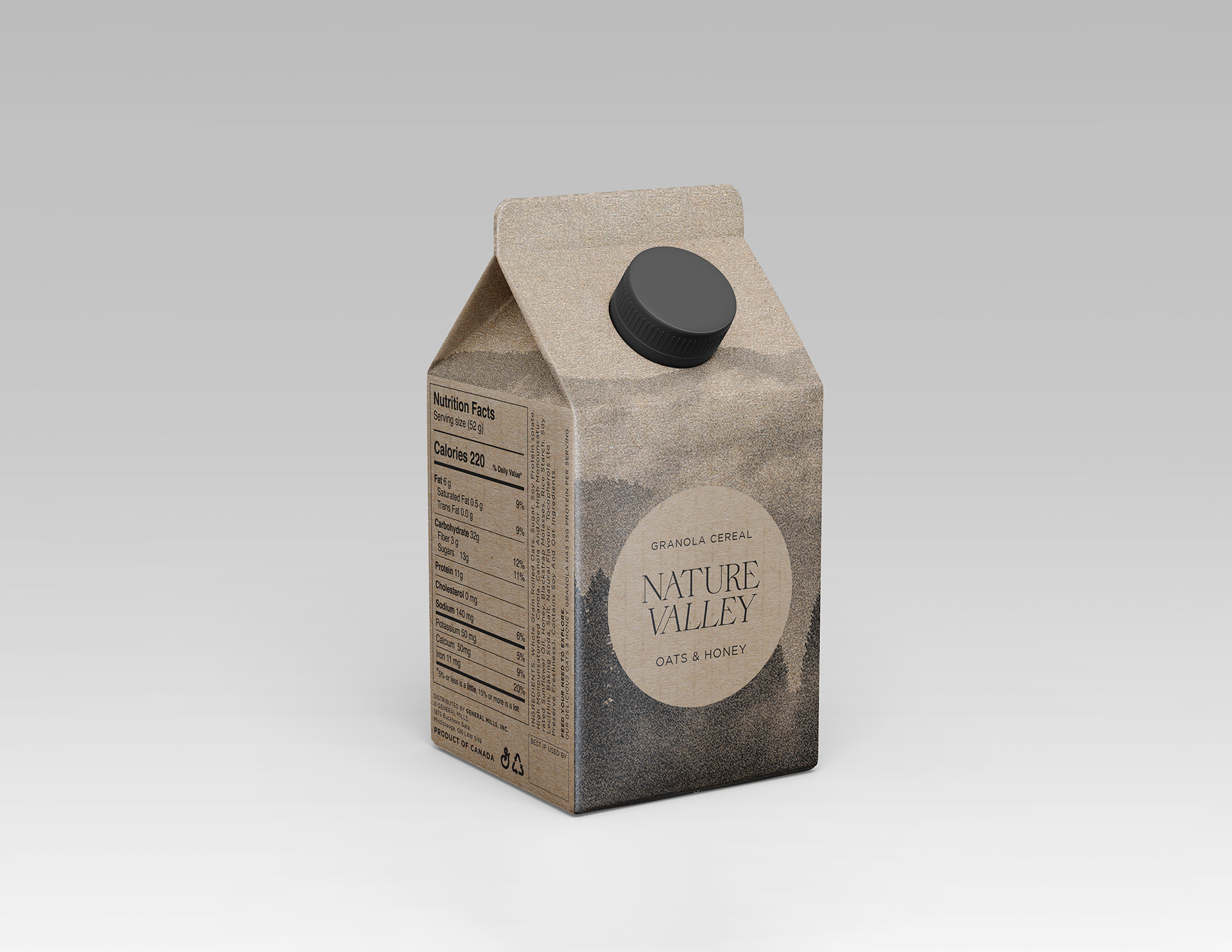 Redesign for Nature Valley Oats & Honey granola cereal. With sustainability in mind, this package moves the product from a plastic bag to a 100% recyclable cardboard carton.