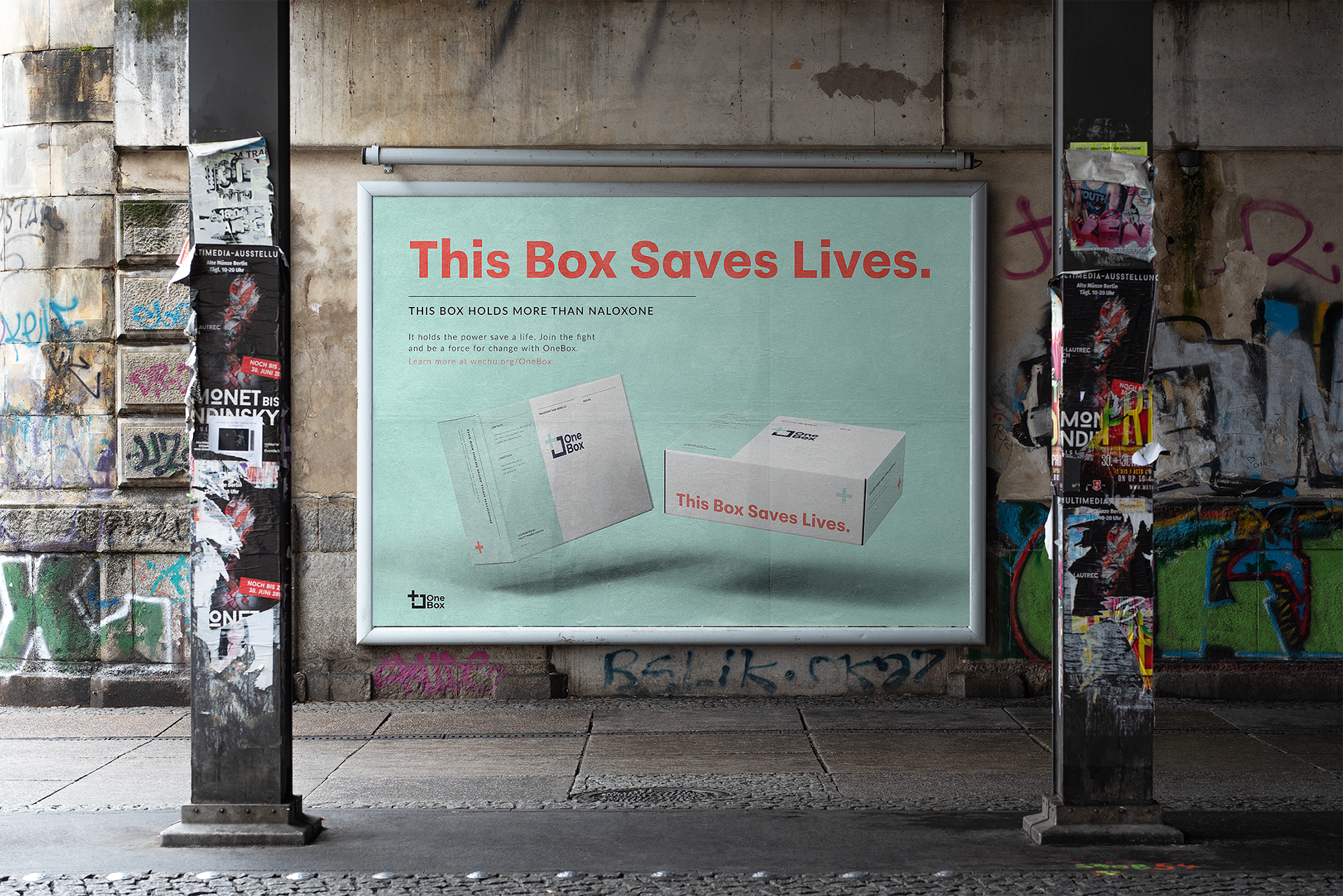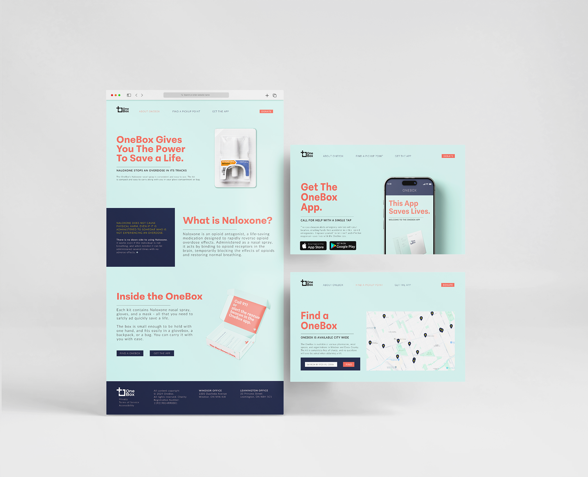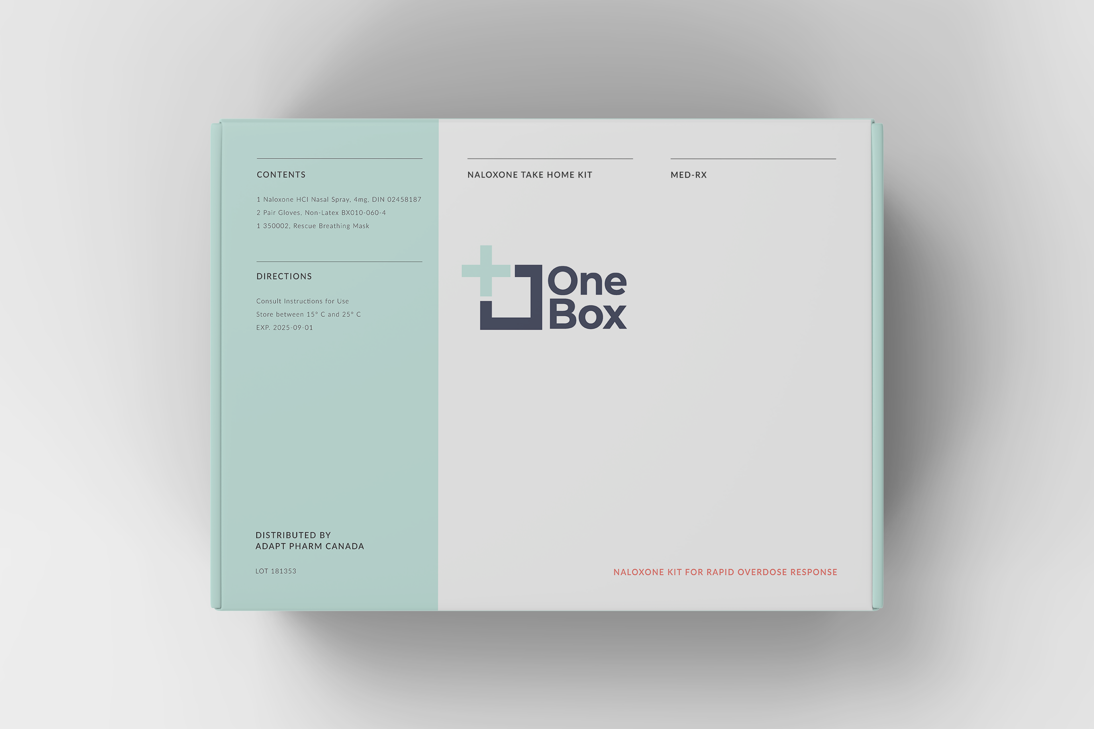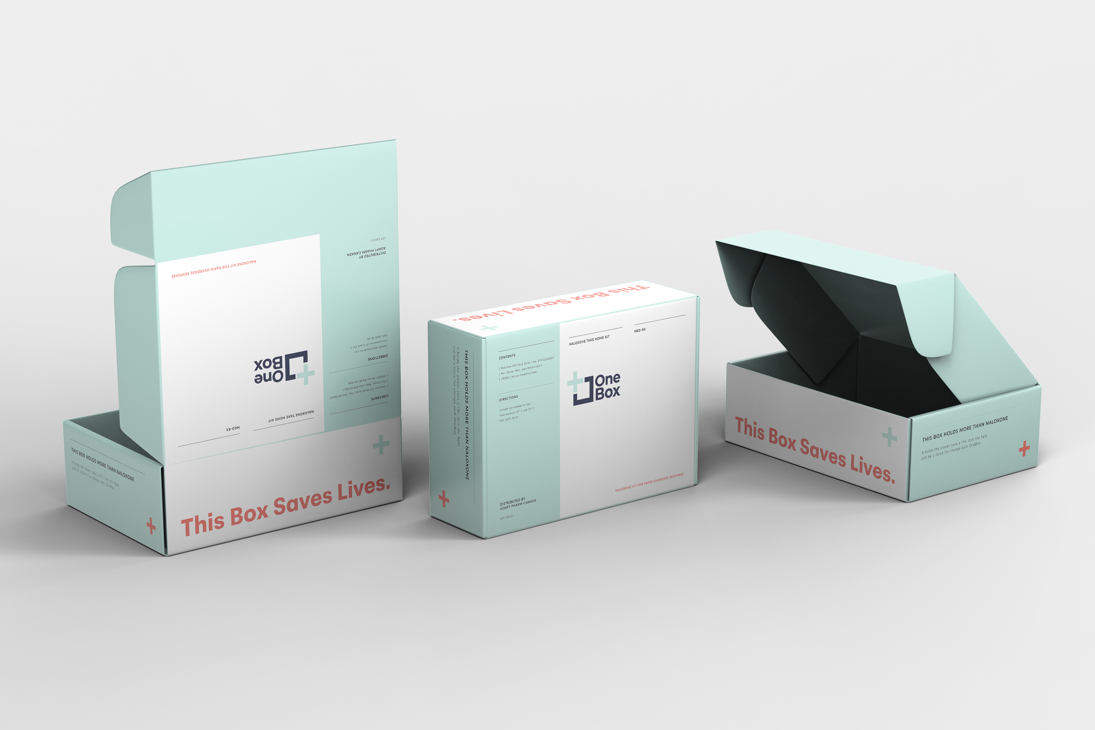 The OneBox is a Nalolxone nasal spray kit designed for distribution of a life-saving tool that neutralizes the effects of an opioid-related overdose. The OneBox is easily opened and compact - small enough to hold in one hand, designed to fit in a glove compartment, backpack, or tote bag. Thoughtfully applied typography and colour ensure that instructions for use are legible and direct, ensuring ease of use for those in panic or under the influence.