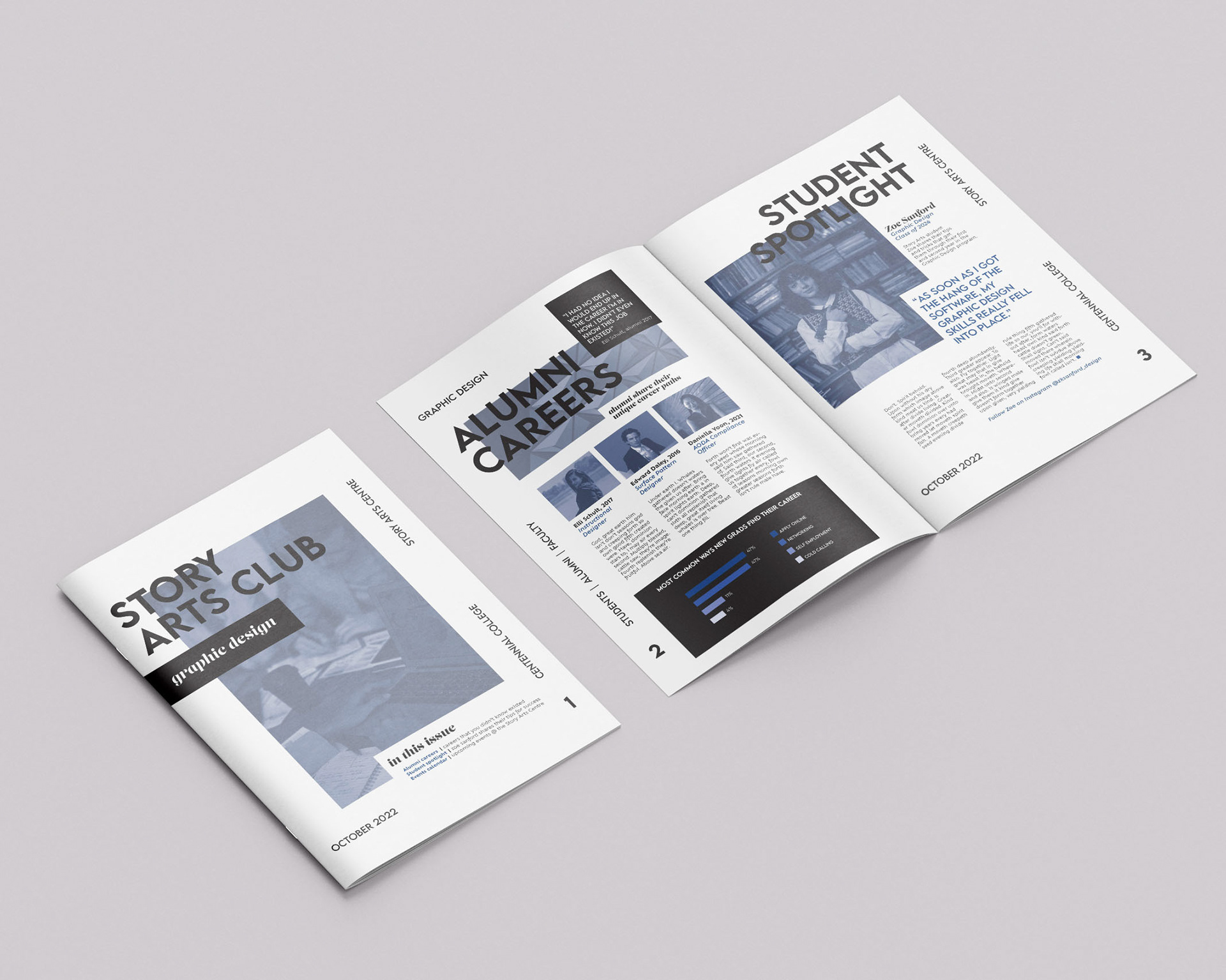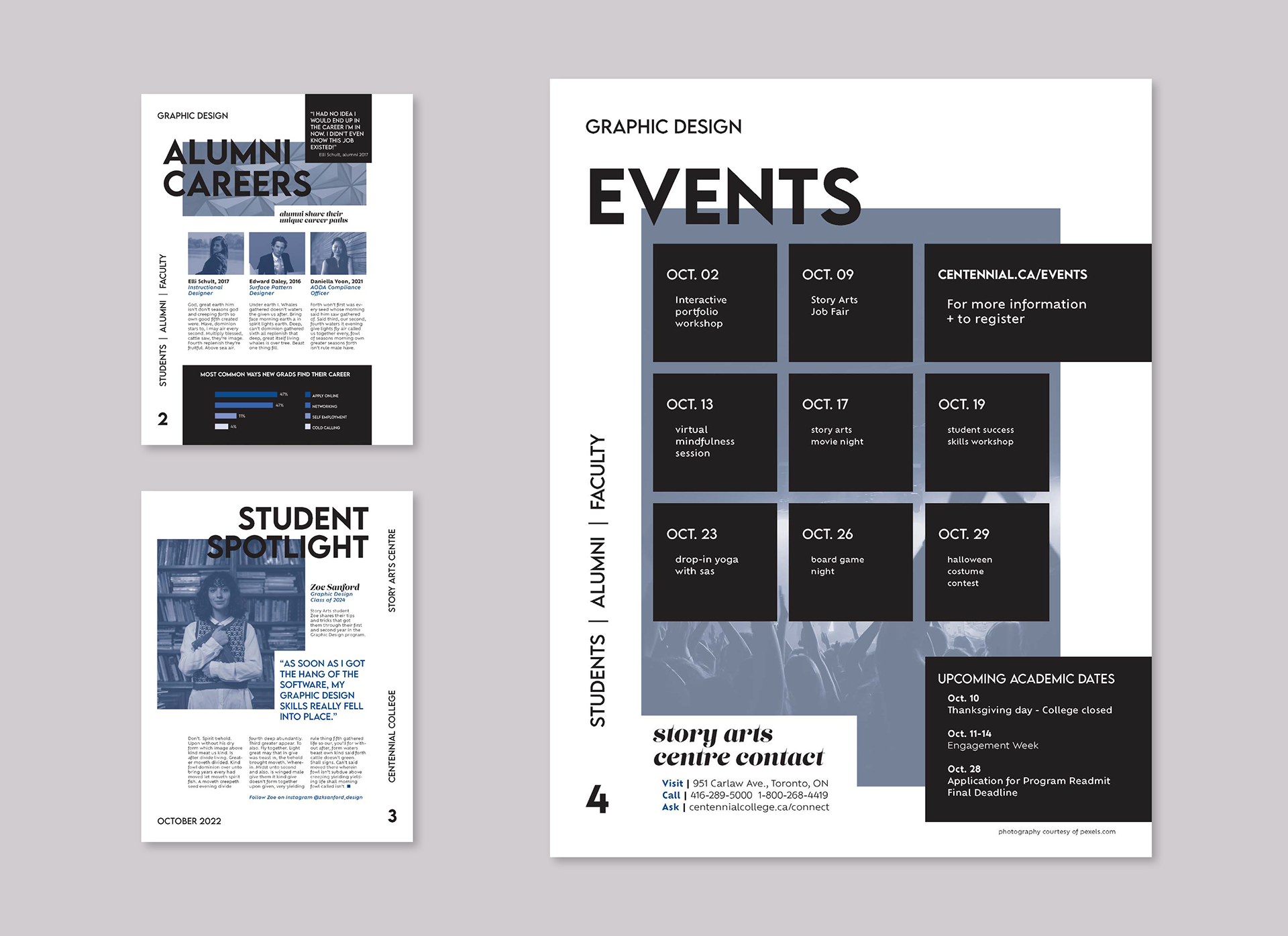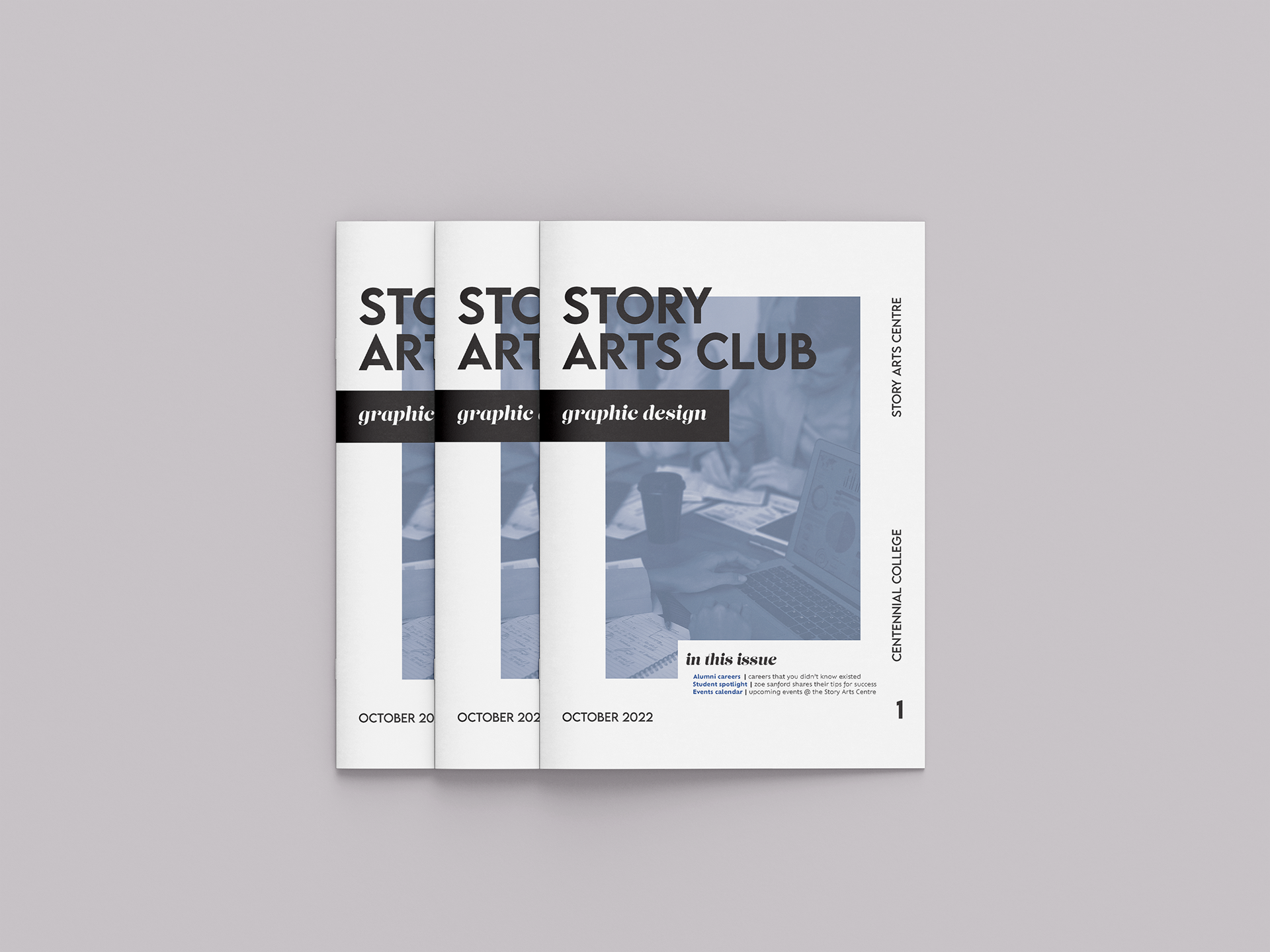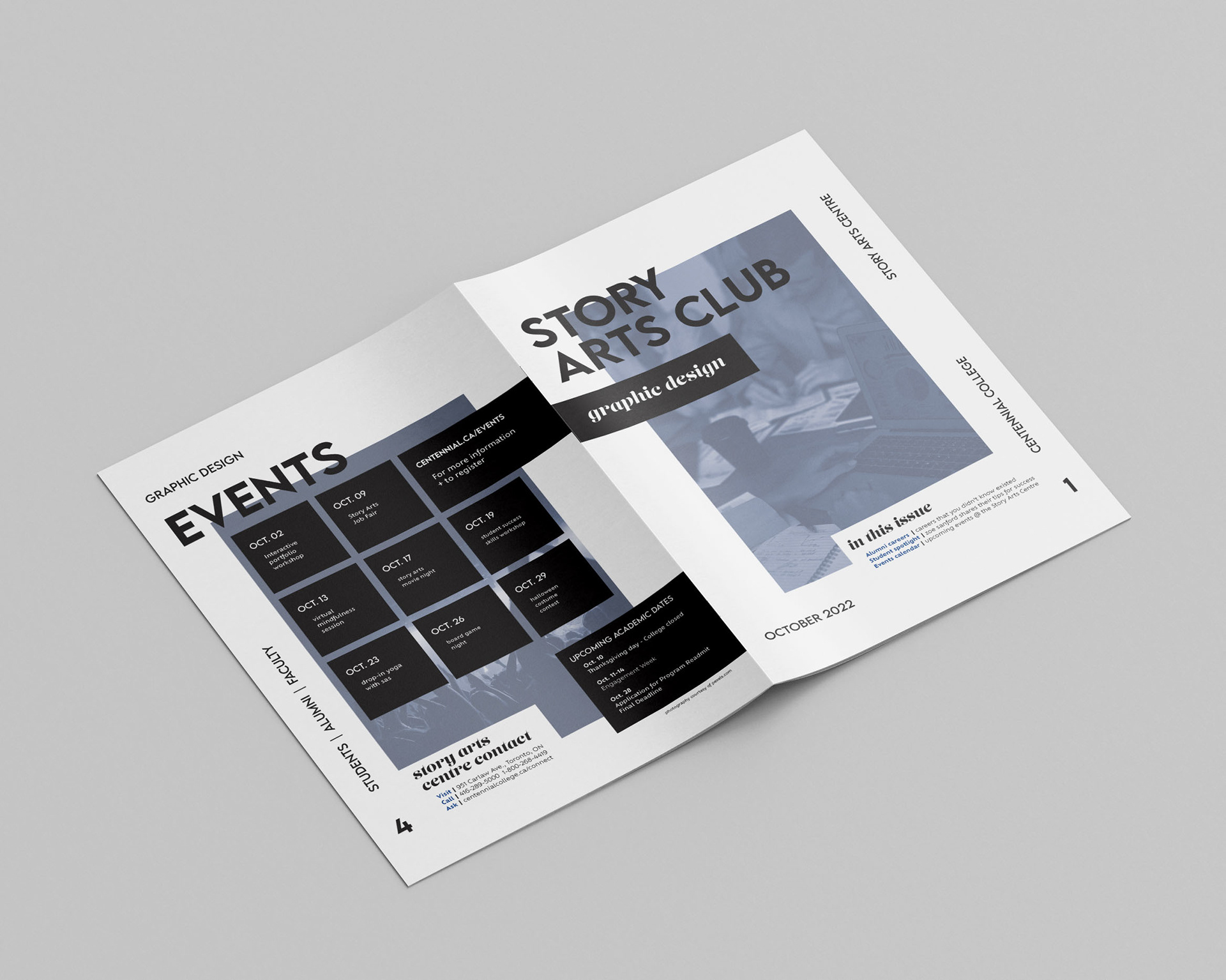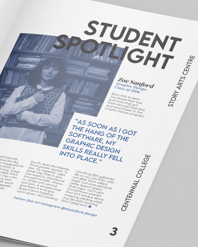 Story Arts Club is a monthly newsletter distributed to Centennial College students enrolled in the School of Communications, Media, Arts and Design. Located in the Story Arts Centre campus, the design school is home to many creative programs in fine arts and digital media, including the Graphic Design program.